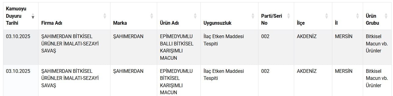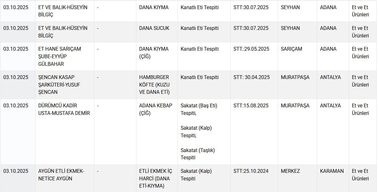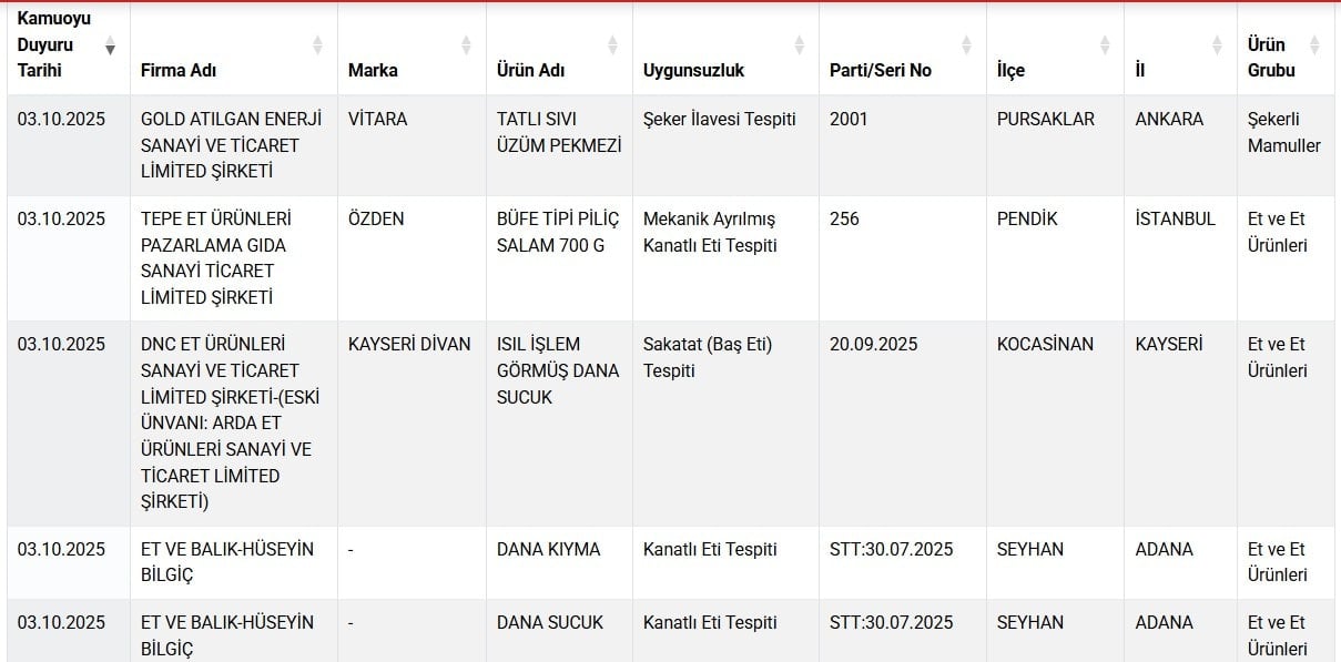 Son güncellemede, 2’si sağlığı tehlikeye düşürecek 22 yeni ürün listeye eklendi. Zeytinyağı, bal, kıyma, sucuk gibi ürünlerde tespit edilen taklit ve tağşiş olayları dikkat çekiyor. Yapılan testlerde, bazı markaların ‘dana kıyma’ olarak sattığı ürünlerde kanatlı eti bulunduğu belirlendi. Pekmez ürünlerinde yapılan incelemelerde şeker ilavesine rastlandı. Bir bitkisel ürün markasında ise ballı bitkisel karışımlı macta ilaç etken maddesi tespit edildi.